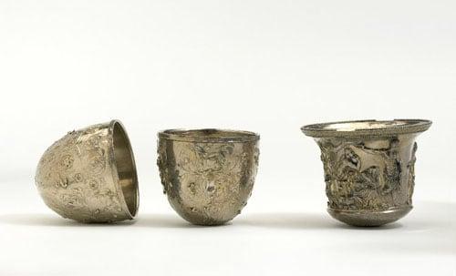 Three silver cups with repousse decoration and traces of gilding. Each has an outer skin and separately-made inner liner. Two are a pair, covered with elaborate flora and fauna. The third depicts the story of Orestes andIphigeneia (from a lost play by Sophocles).