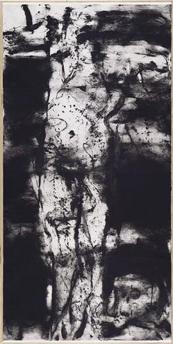 Three large black and white prints, each depicting a naked form in the position of crucifixion