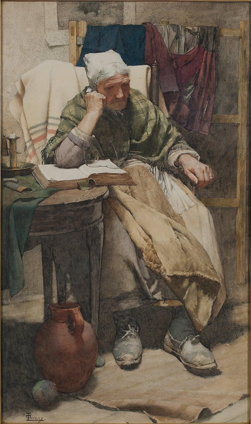 This painting created by Walter Langley shortly aftermoving to Newlyn from Birmingham to pursue a career as an artist. While Langley was an accomplished oil painter he painted predominantly in watercolours, portraying scenes of everyday life in Newlyn and highlighting the hardships that were common during his lifetime. Time Moveth Not is a portrait of a local woman, believed to be Grace Kelynack. Rendered with skill and sensitivity, the work evidences the powers of observation that led to Langley's election to the Royal Institute of Painters in Watercolour. The picture was purchased from the estate of Roland and Beryln Middleton, a couple from Kinver in the West Hidlands, who acquired the picture at auction in the early 1950s. Until the mid-1990s it was thought to be lost, until the Middletons chanced upon Penlee House and revealed its whereabouts.