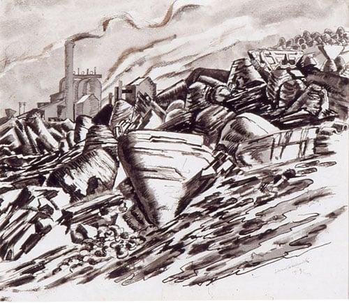 From a group of drawings shown at Leicester Galleries Jan 1920. Not a reflection of a dying industry but perhaps as an unconscious reaction to the decline and disillusion that shaped Eliot's title: 'The Waste Land'. Signed and dated.