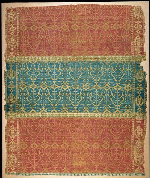 This Safavid silk cloth is part of a cloth which would have adorned a Shiite cenotaph in Iraq or Iran. It bears an inscription which includes the date 1122 of the Hegira (equivalent 1710-11 AD), and thus dates from the reign of Shah Sultan Husayn Safavi (1694-1722), a ruler noted more for his piety than political acumen. The inscription in oval cartouches reads, 'Oh Imam Husain, the Martyr!' and refers to the prophets grandson who was martyred at the battle of Kerbala in Iraq in 680 AD. The inscription in the smaller cartouches reads 'Oh Mohammad!' referring to the Prophet. Both inscriptions are written in mirror image writing and are deliberately designed to look like faces.