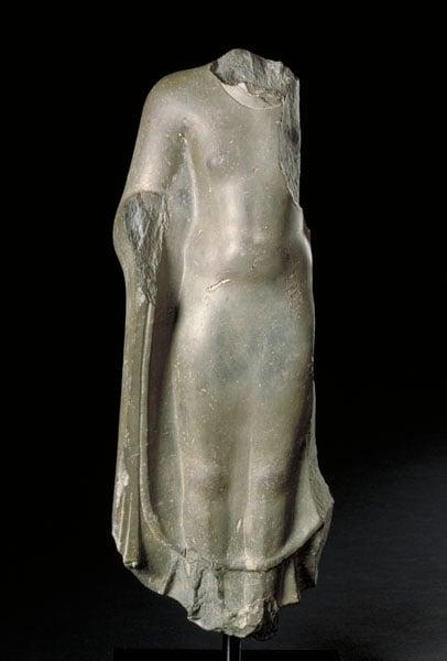 This torso is from one of the earliest kingdoms in Thailand, known only from the most fragmentary inscriptions as 'Dvaravati'. The figure is damaged, missing both lower arms, head and feet. The sculpture represents the standing figure of the Buddha and, in its original condition, would have had both hands raised in the gesture of exposition or disputation. The figure is clad in the unadorned robes of a monk, the waist cloth visible below the curved hem of the outer garment which covers both shoulders and hangs in pleats from the outstretched lower arm. The monastic robes cling to the figure defining its form clearly although, in keeping with the Indian convention this style follows, the anatomical details of gender are absent. As is characteristic of the style of this period, the figure is represented in a strictly frontal posture, with the weight evenly distributed.