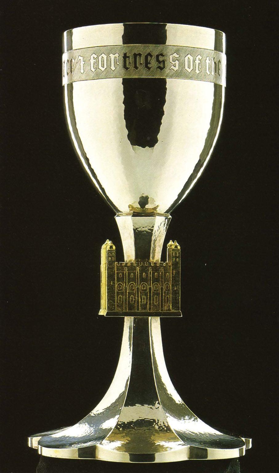 Robert Welch believed that good design should be universal, a belief that inspired him to accept this commission to make a commemorative piece. Most limited-run commemorative pieces were mechanically mass-produced with no artisanal touch – this hand-crafted goblet was Welch’s attempt to produce a worthwhile commemorative item. Welch drew upon medieval designs for his inspiration, adopting lobed base of a medieval chalice and Gothic lettering inspired by the V&A’s 15th-century Studley Bowl. Welch grew up in Malvern, less than 25 miles from Chipping Campden, and the goblet joins a permanent display of Welch’s work at Court Barn Museum.