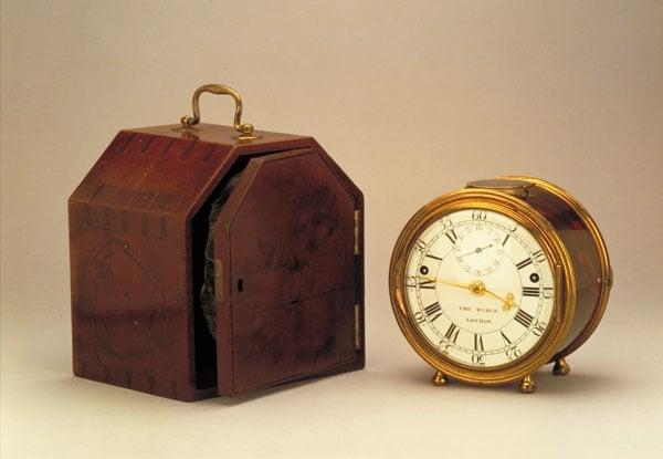 Lord Polwarth's travelling clock. The movement is housed in a tortoisehell-covered brass drum case, enclosed in a mahogany carrying case.