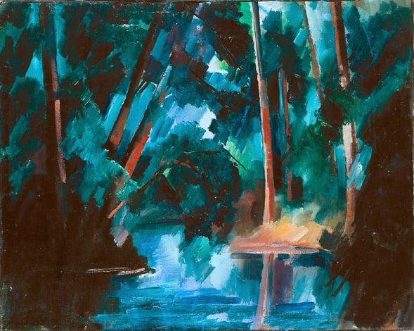 'Trees', formerly titled 'L'Etang' is now thought to portray the banks of the Seine near Bougival and is a very characteristic example of Vlaminck's obsessive emulation of Cézanne's construction of landscape, his painterly technique and his systematic way of conveying form through colour. The Cézanne memorial exhibition in 1907 had a profound and sobering effect on Vlaminck and as a result his palette shifted from hot to cool colours, and he was inspired by Cézanne's architectural order and regard for space and depth.