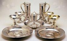 2 large breadplates, 2 flagons, 4 chalices, a Baptismal ewer, and a laver. One breadplate depicts a communion table set with the silver and a man kneeling to take communion.