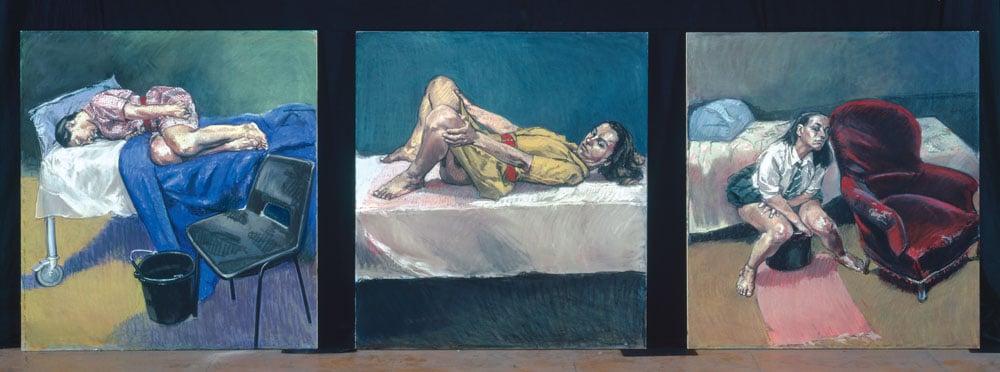 As a youth, Rego had witnessed the terrible suffering caused by illegal abortion in Portugal, and was angered by people's apparent refusal to face up to the issue. This work reveals the unseen misery of illegal terminations, each panel depicting the aftermath of a girl lying doubled in pain or crouched over a bucket, alone in her sufferings.
