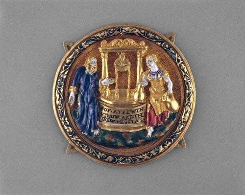 Hat-medallion depicting 'Our Lord at Jacob's Well with the Woman of Samaria'. The architectural canopy over the well is an early example of Classical Renaissance composition in England.