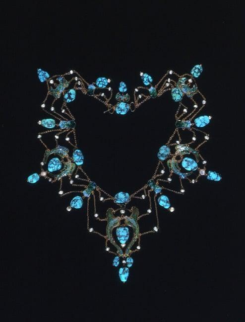 Watts' greatest passion was the skilled enamelling of plaques, metalwork, and pieces of jewellery and this necklace is a rare example of his mature work. Carefully balanced, festooned chains interspersed with tiny freshwater pearls support foiled enamel pendants and turquoise stones. His enamelling skills are apparent in the remarkable depth and brilliance of colour of the pendants, shading from palest blue to bright turquoise. Here he has utilised his favoured foiled enamelling to achieve such delicacy of tone and detail. In this technique layers of translucent colour were slowly built upon a ground of textured metal. Each layer of colour, mixed with oil or water, was applied and fired individually to create the desired effect and the temperature carefully monitored to ensure that the previous work was not damaged.
