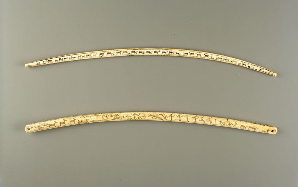 These drill bows, made by the Inupiak people of northern Alaska, are decorated with scenes representing the hunting of land and sea creatures, a theme cherished by the Eskimos. One depicts geese flying and being netted and the other fantastic scenes of dancing caribou and monstrous beings performing around people's houses. They were primarily used to drill holes by a technique that is still in use today. A wooden shaft would be attached to a bit-like mouthpiece held between the user's teeth, freeing both hands. Attached horizontally to the top of the shaft would be the drill bow, a thong extending from the bow to the shaft. As the drill bow is moved from side to side, the thong tightens around the shaft, which rotates, driving it into the surface to be drilled. They were part of a large and varied collection of 30 works of ethnographic art, formed by W. O. Oldman, which the Art Fund presented to the nation on account of its 'exceptional merit'.