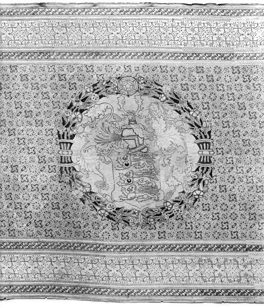 1) In tent and stem stitch. Circa1550. 3 medallions on a diaper ground. Arms of the Giffard family of Steeple Claydon, dims 5.61 x 54 m.2) Tent stitch, made in 1602 for the marriage of Oliver St John. 4.27 x 2.08 m.