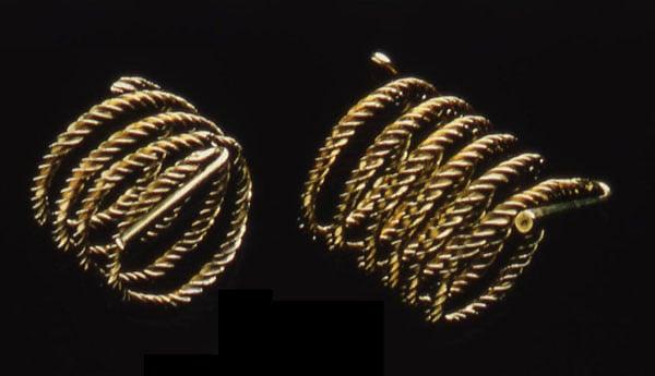 Two gold armillae in spiral 'spring' form. Known as the Malspa Torcs, discovered at New Egerton Hall while digging foundations of a barn in 1829.