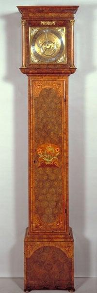 1) Long Case Year Equation Timepiece (The Drayton House Clock). Veneered with burr walnut and with narrow herring-bone bandings with year movement, circa 1695-1700; 2) Astrolabe Longcase Clock, circa 1680. Olive wood mouldings decorated with panels of flowered inlay. It also records movements of the sun, moon and certain stars.