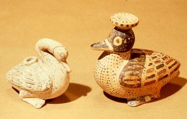 Two perfume containers painted & modelled in the form of birds. Decoration is entirely painted and no incision is used. Duck; 8.3 x 9.7 x 5.5 cm. Swan; 6.3 x 6.9 x 4 cm.