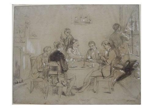 Two series of 5 drawings, studies for oil paintings: 1) 'The Road to Ruin', signed and dated 1879 (should be 1878) including no 1 depicting a group of six men seated around a table and playing cards at a college in Cambridge (main illustration) and no 3 The Arrest depicting a domestic interior with two policemen carrying bowler hats presenting a warrant to a man smoking a cigar standing by a fireplace; 2) 'The Race for Wealth', (circa 1893) including No 1 In the Spider's Office depicting a scene in a financier's office, with the financier in the centre surrounded by people seeking his attention.