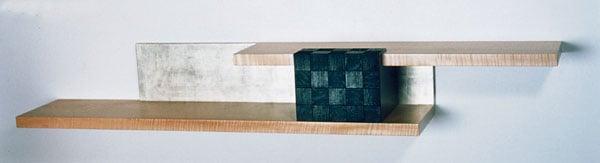 The sycamore shelves are linked and secured by a dark, bog oak box where the alternating end-grain direction produces a chequerboard effect. The shallow back panel is covered in burnished squares of white gold leaf. The Waleses are known for the strong graphic images they create with different wood constructions.