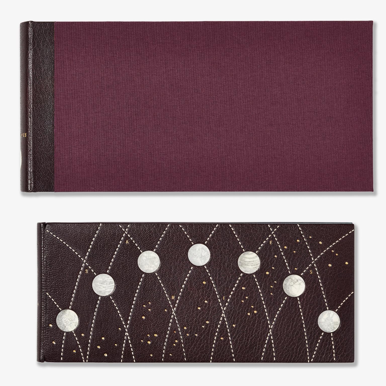 Full dark burgundy goatskin, letterpress print, vellum while leather only, gold and white gold leaf
