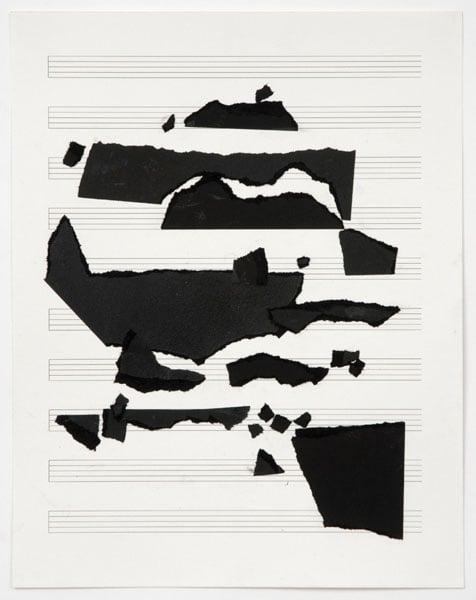 Chan is proving himself to be a key emerging figure in contemporary drawing. This set of 7 untitled drawings comprise of charcoal and layers of black paper mounted onto blank sheets of music. They provide a visual link to the artist's best known work, 'The 7 Lights', particularly in their exploration of shadow and light. The blank musical score indicates an apprehension and a desire to read the pieces as music, but the shapes exceed the confinement of the lines, hinting at a loud, brash and dark soundtrack to accompany an apocalypse last light. As original works, the untitled works also address the idea of drawing as a way of thinking and approaching other disciplines like music. This collection was presented by the Art Fund through Art Fund International.
