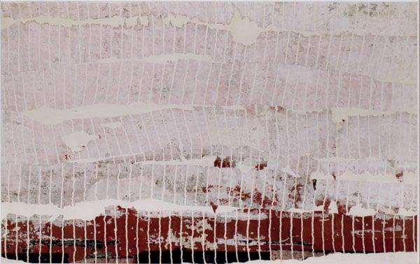 Gwyther Irwin used the Meadow Studios in Bushey from 1955 until the late 1960s. The Meadow Studios were set up for Herkomer graduates in 1892 and they later became a focus of artistic activity in Bushey. Bushey Museum has work by many of the artists who occupied a Meadow Studio and Untitled is a valuable addition to that collection. Irwin spotted the creative potential of discarded London Transport posters, using the reverse (pasted) side in collage with its subtle staining as the surface. The posters were torn into strips and reassembled with a grid of the base colour inbetween. This work was acquired with the support of the Art Fund with the assistance of the Esmée Fairbairn Foundation.