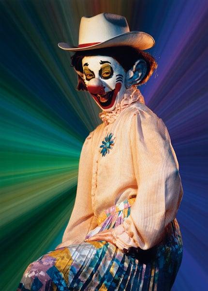 This is one of the first five images from the Clowns series started in 2003. Sherman's clowns feature riotous makeup, flamboyant costumes and digitally produced backgrounds of synthetic colours and patterns. Behind the visual lushness and latent humour/horror of the portraits lies the artist's interest in revealing the underlying pathos of the hysterically happy or intensely nasty clown. Sherman has said she 'uses clowns to show the multi-layered emotional depths within a painted smile'.