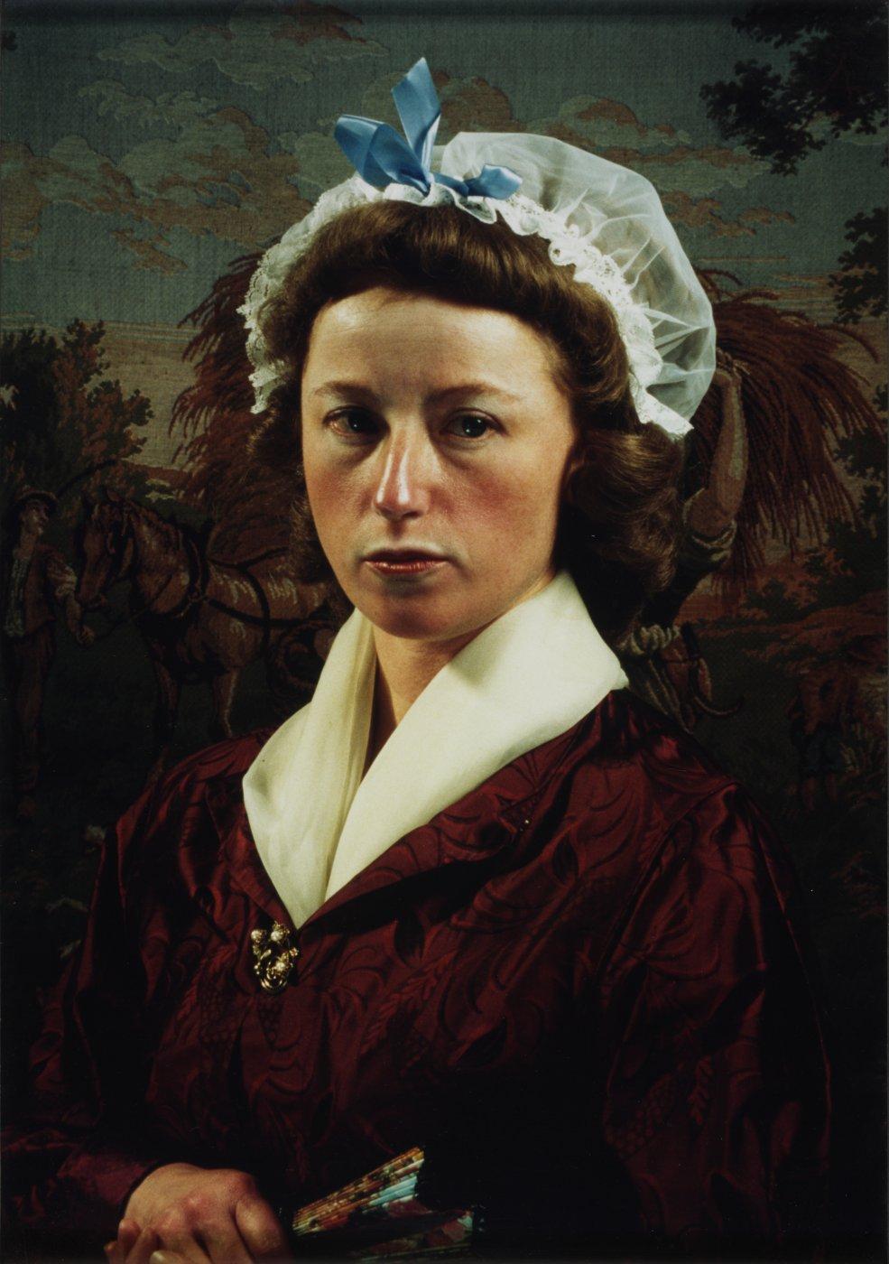 The artist appears in the guise of Marth Washington (1731-1802), wife of the first President of the United States. Turning to face us in three-quarter profile, she adopts a modest pose typical of 18th century female portraits, with her gaze demurely cast to one side. Her hands are pressed closed to her body, clutching a closed fan. As with all of Sherman's photographs there is something disconcerting about the image which makes us question the convention she adopts - for example, the shiny face, sunburnt face and glassy eyes reflecting the studio lights confront us with the real woman behind the costume.