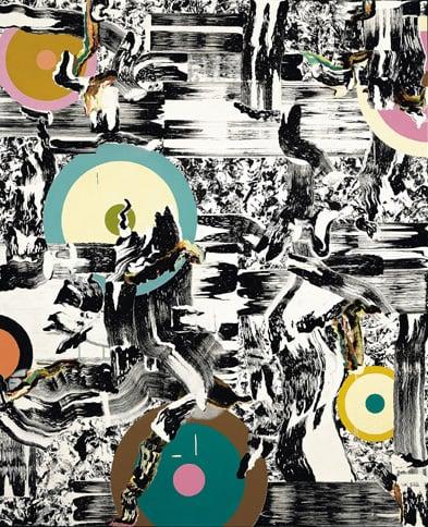 Abstract painting with discs of colour on a background/foreground of black and white
