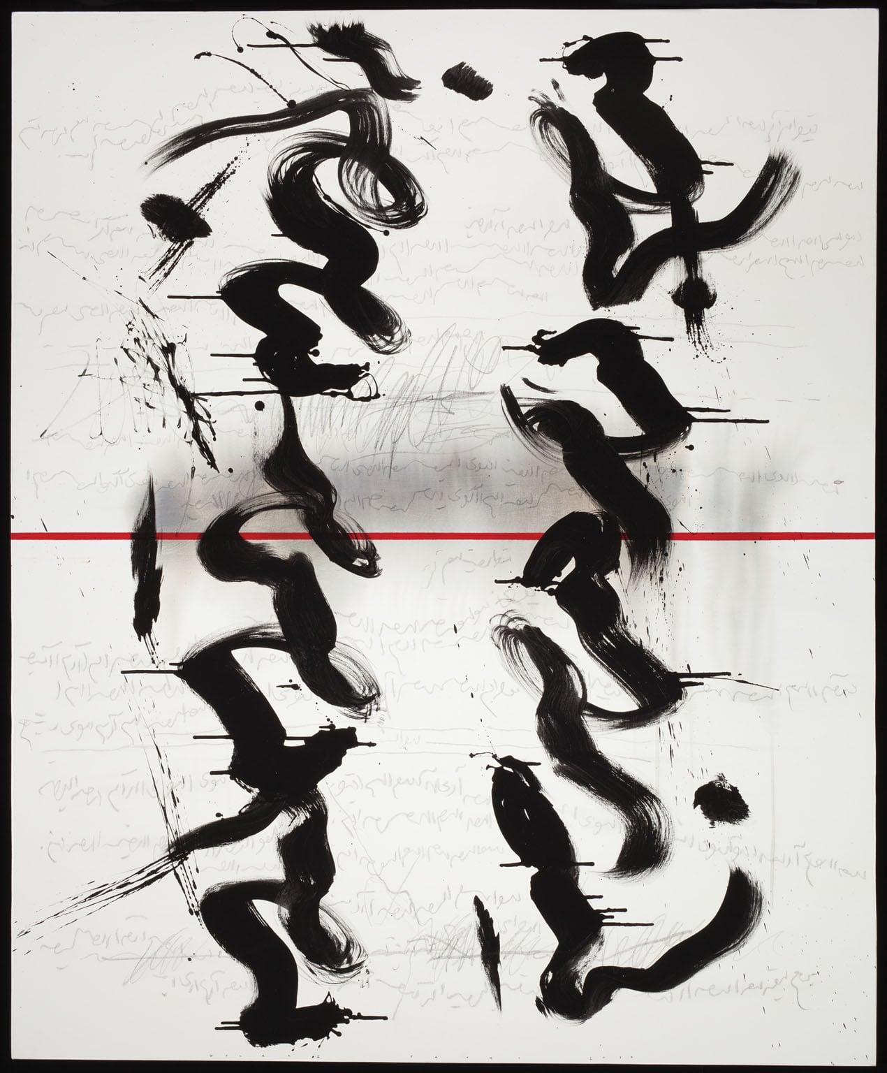 The Iranian artist Golnaz Fathi began to experiment with abstract art forms as a means of escaping the rigours and constraints of a formal training in calligraphy. In this work, what at first sight appear to be layers of inscriptions made in Persian Calligraphy , reveal themselves on closer inspection to be abstract, gestural strokes – never quite forming into discernible letters. In places smudged, partly obliterated, or seeming to wander off, trailing over the edges of the canvas, they are open to interpretation by anyone, irrespective of language or identity, and can be read on many different levels. In a political climate where many artists must employ caution in portraying the regime under which they live, a great deal of contemporary Iranian art attempts to bury meaning in layered symbolism. This painting epitomises such a way of working. It is dense with potential meanings and interpretive possibilities, evoking very personal readings and responses. This painting will form the centre of a new collection of work by Iranian artists, brought together to form a central narrative - Iranian Identity in art: bridging the traditional and the contemporary – which is being featured in the new World Stories: Young Voices gallery opening at Brighton Museum & Art Gallery in June 2012.