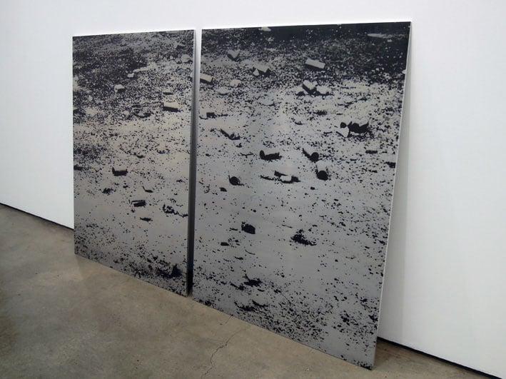 Printed in monochrome on an aluminium panel, this stony urban landscape littered with discarded tear gas canisters blurs the boundaries between traditional landscape and battlefield painting.