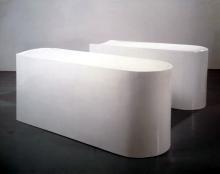 This is one of a series of works based on mortuary slabs. One of the parts is a direct cast of the top of such a slab, with its lightly hollowed surface designed to capture bodily fluids and channel them away. The second is a cast of that same concave surface, turned upside down so that it forms a convex shape, this time bordered by a narrow lip. The pair of sculptures would lock tightly together if one were placed upon the other. Rigorously minimalist in appearance, these are nonetheless strongly emotive works. They are Whiteread's first bronze sculptures, and her first works made specifically for outdoor exhibition. Untitled (Pair) will be sited in the grounds of the Scottish National Gallery of Modern Art, joining works by Henry Moore, Barbara Hepworth, Tony Cragg and others.