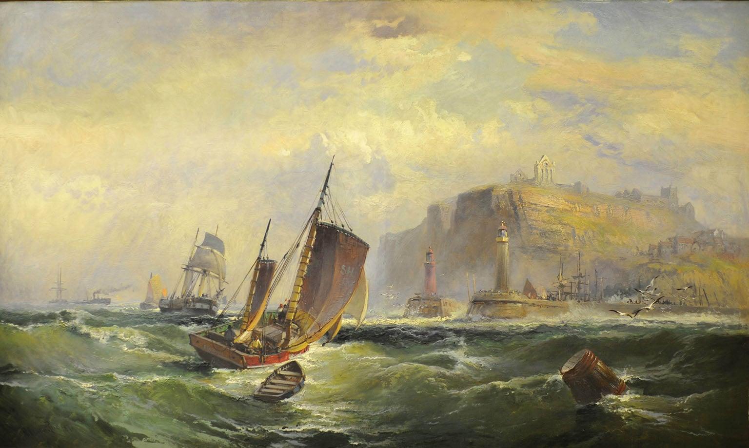In this painting a fishing fleet is forced to abandon its work and head for the harbor as a storm front approaches from the sea. On a cliff-top above the harbor, the white stone of an abbey catches the sunlight, a beacon of hope for the boat crews. The two arms of the harbor, each crowned by a lighthouse, identify the coastal town as Whitby, while the vessels depicted are drawn from very different eras – a local fishing boat, an older square-rigger, and a steamer in the distance.