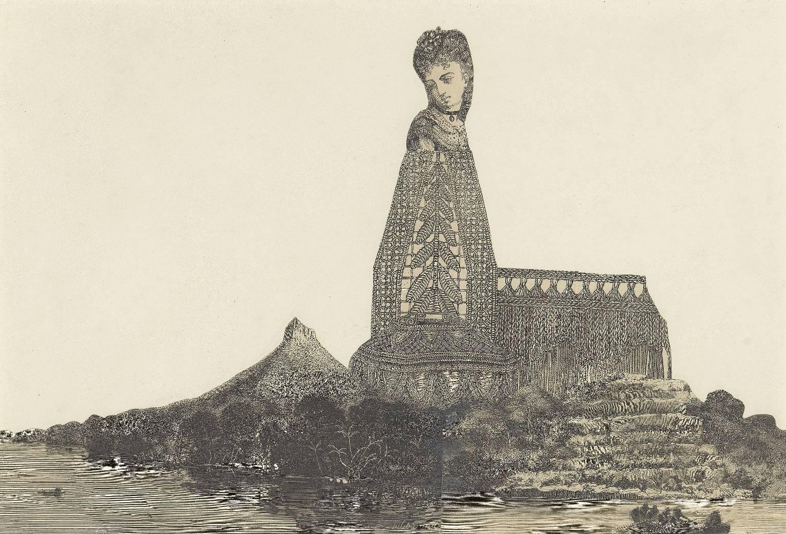 The imagery in Untitled (Seascape with Bird and Island) illustrates these themes. In a surreal scene, a colossus with the head of a Victorian woman appears to be scaring off men who are shown clambering from the island and rowing away in a boat. Issues of colonialism are also addressed, with the head representing a conquering European power while the fleeing people are indigenous. The picture incorporates fragments of Victorian engravings in the manner of collages made by Peter Blake and other Pop artists of this time.