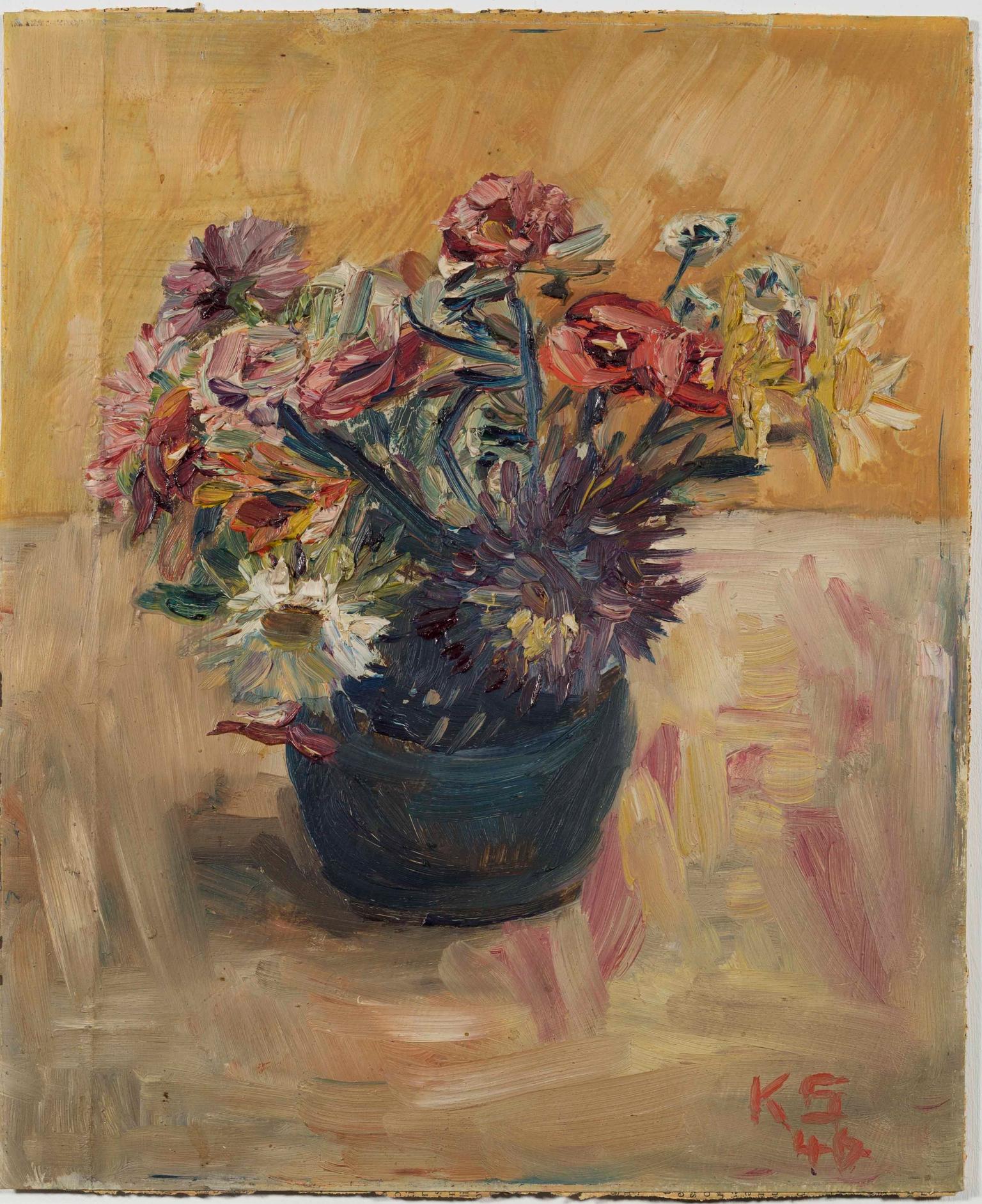 This impastoed still life shows a vase of flowers on a tabletop. The reverse of the painting features a collage of newspaper clippings on topics ranging from nationalisation to hula dancing.