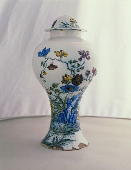 A polychrome baluster vase decorated with large red and mauve flowers above contorted rocks in a pool of water, and clumps of leaves in the foreground. The Delftfield Pottery was founded in 1748 with workmen from Lambeth and Liverpool.