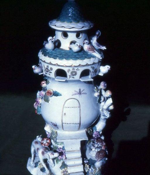 Baluster shaped vase in the form of a dovecot, designed to hold pot-pourri. It is perched on a rocky base and depicts a dog approaching a flight of steps. Apple boughs grow up the side of the dovecot and the lid which forms the roof is decorated with birds and scale tiles. Polychrome decorations include insects by the Moth Painter.