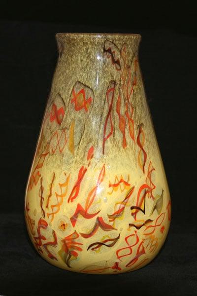 Vincent was the son of Salvador Ysart who moved to Perth from Spain with his family and had a large impact on the production of art glass in Scotland with the inception of Monart glass and later Vasart glass both based in Perth. The YsartÂ’s established a tradition of art glass in Scotland, which had not existed before. Their creations inspired future generations of Scottish art glass as well as individual makers. This piece with its unique filigree cane decoration was made as a birthday gift for the artist's wife. The style of the vase reflects the influence of Vincent YsartÂ’s Spanish roots. The design of this particular piece is evocative of native painter Joan Miro in terms of the organic forms and colour.