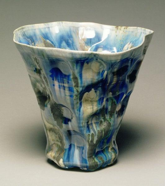 Stoneware painted in blue, green, grey, brown and cream variegated glazes mark 'T '97' incised.