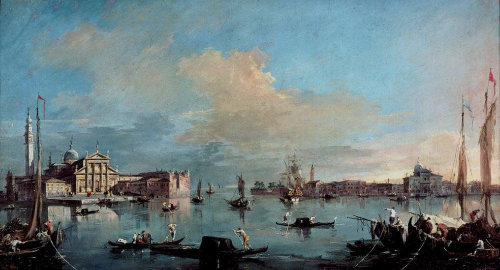 This sparkling view of Venice is among the most attractive painted by Guardi. The picture was painted from the Piazzetta with the church and monastery of San Giorgio Maggiore on the left and the eastern end of the island of the Guidecca with the Campanile of San Giovanni Battista and the church of the Zitelle on the right. His technique is more spontaneous than Canaletto's, employing flickering brushstrokes and an enchantingly vivacious light to evoke the magical atmosphere of the city. The painting was part of the Ernest Edward Cook's collection who bequeathed the entire contents of his house to the Art Fund. The bequest comprised of over 150 paintings, tapestries, furniture, silver and porcelain and was distributed to nearly 100 UK galleries.