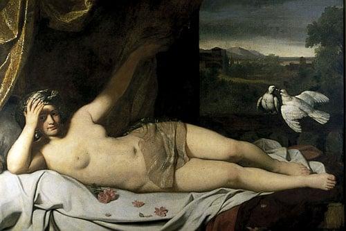 In this painting, the nude Venus reclines on a bed strewn with rose petals. Her left hand pulls back a brocade curtain to reveal a landscape background and two doves are perched in the middle ground of the painting. This painting was part of a collection of 117 works belonging to the industrialist and engineer F.D. Lycett Green and bequeathed to York through the Art Fund, in 1955, in recognition of the remarkable efforts made after the Second World War by its curator to transform it into a gallery of international importance.