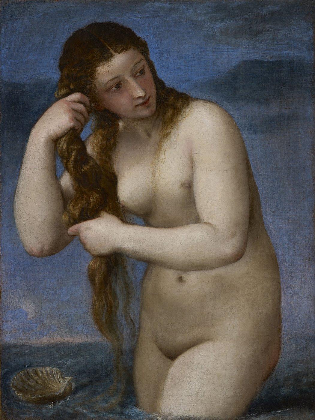 According to legend, she was born fully grown from the foam and blown ashore on a scallop shell, landing near Paphos in Cyprus. The great painter of antiquity, Apelles had painted a similar work, and Titian was deliberately inviting comparison between them by choosing to paint this subject.