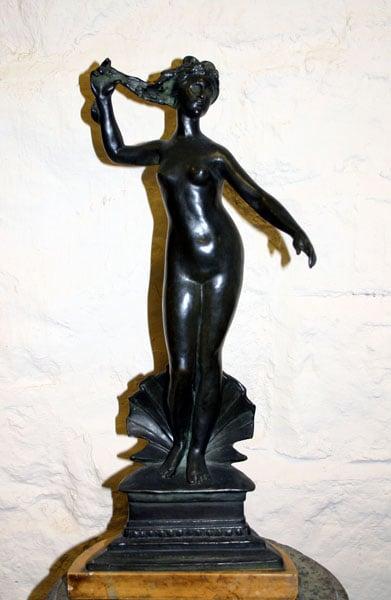 Bronze statuette of nude female holding a lock of her hair. Part of one gift and one bequest to 14 museums by Phillippa Holliday through the Art Fund between 1933 and 1935.