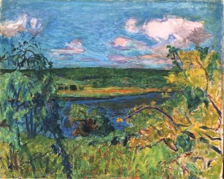 This is a characteristic Bonnard landscape in rich blues and greens. With vegetation in the foreground and a river in the middle distance, the low wooded hills rise to a blue sky, across which float white clouds.