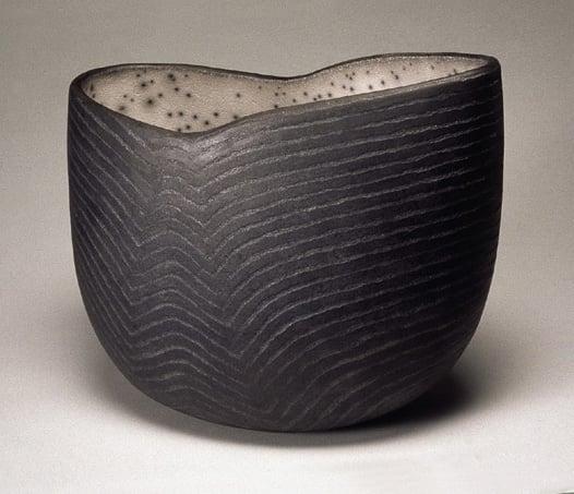 Hand-built and raku glazed oval vessel. The exterior is almost black with horizontal lines producing an optical illusion of a pleat. The interior is white with mottled and crazed black markings. The vessel is marked 'DR' in an impressed seal.