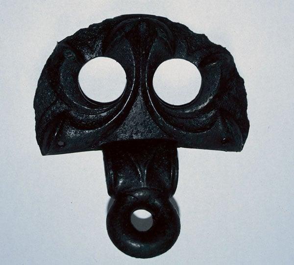 D-shaped plate integrally cast with a clasp-like collar and a suspension loop. The plate is decorated with a design of two trumpet coils which curve around a pair of circular voids giving the impression of an anthropomorphic or zoomorphic face. The curvature of the plate suggests the escutcheon was mounted on a large globular vessel such as a cauldron.