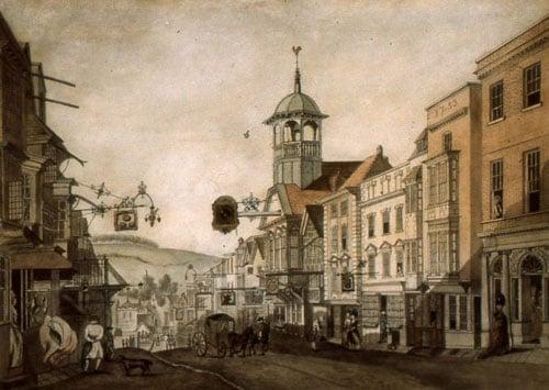 This watercolour view of Guildford is one of the earliest known paintings of Guildford High Street, the heart of the ancient borough, showing in detail its buildings and its famous clock.