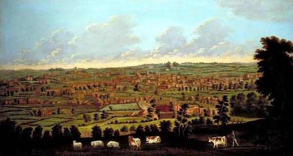 Leeds was the world centre of the woollen trade when this panoramic view of the city and its environs was painted. It provides a record of Leeds in the late 1790s, at an early stage in its development from rural to manufacturing centre, and just before its Georgian architecture was overwhelmed by massive rebuilding and industrial expansion in the early nineteenth century.