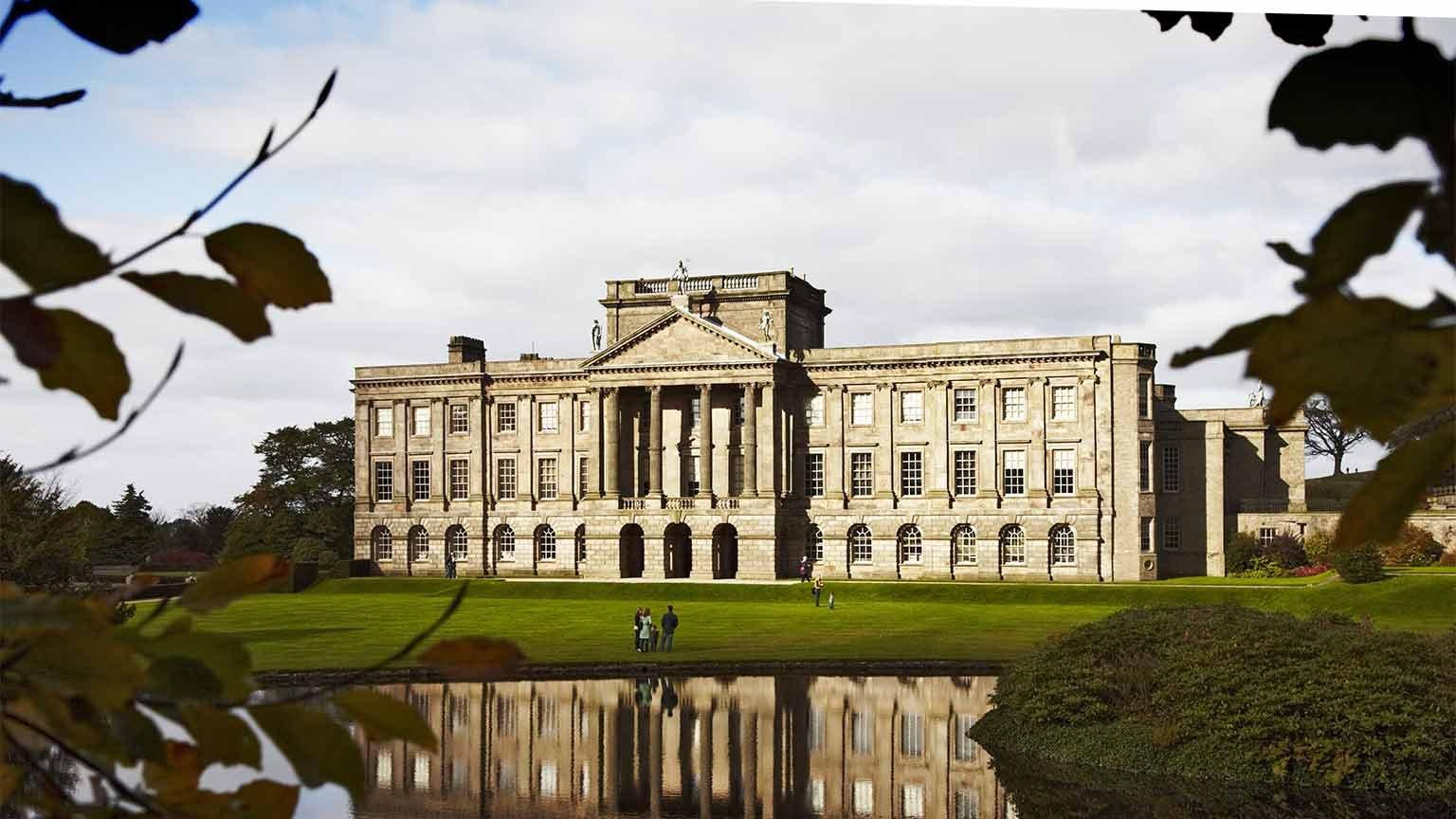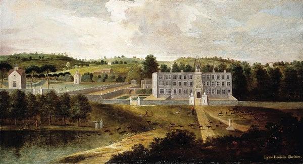 View of Lyme Hall showing surrounding gardens and field with workers and deer.