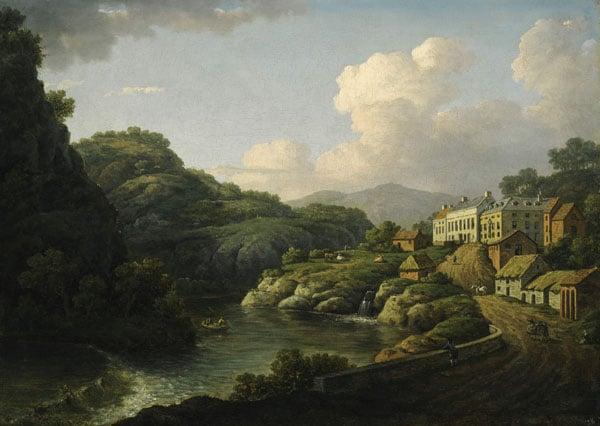 This view of Matlock Bath depicts the River Derwent, the improved road system and the Old Bath Hotel catering for tourists to the area. Like many contemporary paintings it shows people going about their daily business; walking, fishing, riding which is typical of MarlowÂ’s style. The painting was engraved by S Middiman and published in BoydellÂ’s Views in 1789 and the museum holds some hand coloured prints from engravings of MarlowÂ’s work by Boydell.