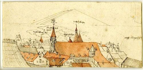 View of Nuremberg from a height by an anonymous early 16th century German artist from the School of Nuremberg. Previously attributed to Albrecht Durer.