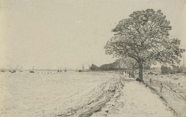 One of 15 sketches by Constable which were removed from the recently discovered Hornby Album and sold at Crewkerne. This drawing comes from the larger of 2 sketchbooks used by Constable in 1816 and belongs to a group of pages which he apparently removed and mounted on larger sheets. Shows the Town Quay and Anchorage from the Platform, which no longer exist.