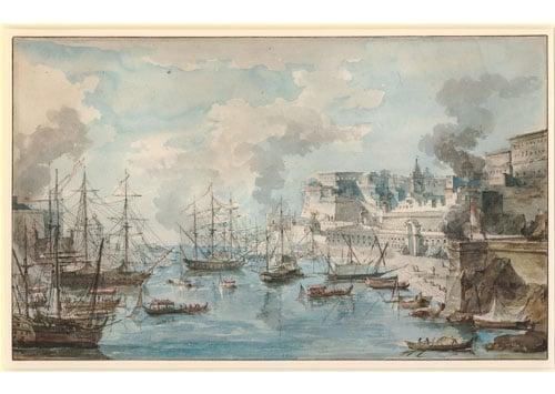 The town and its fortifications are on the right; the harbour is full of shipping of various kinds.
